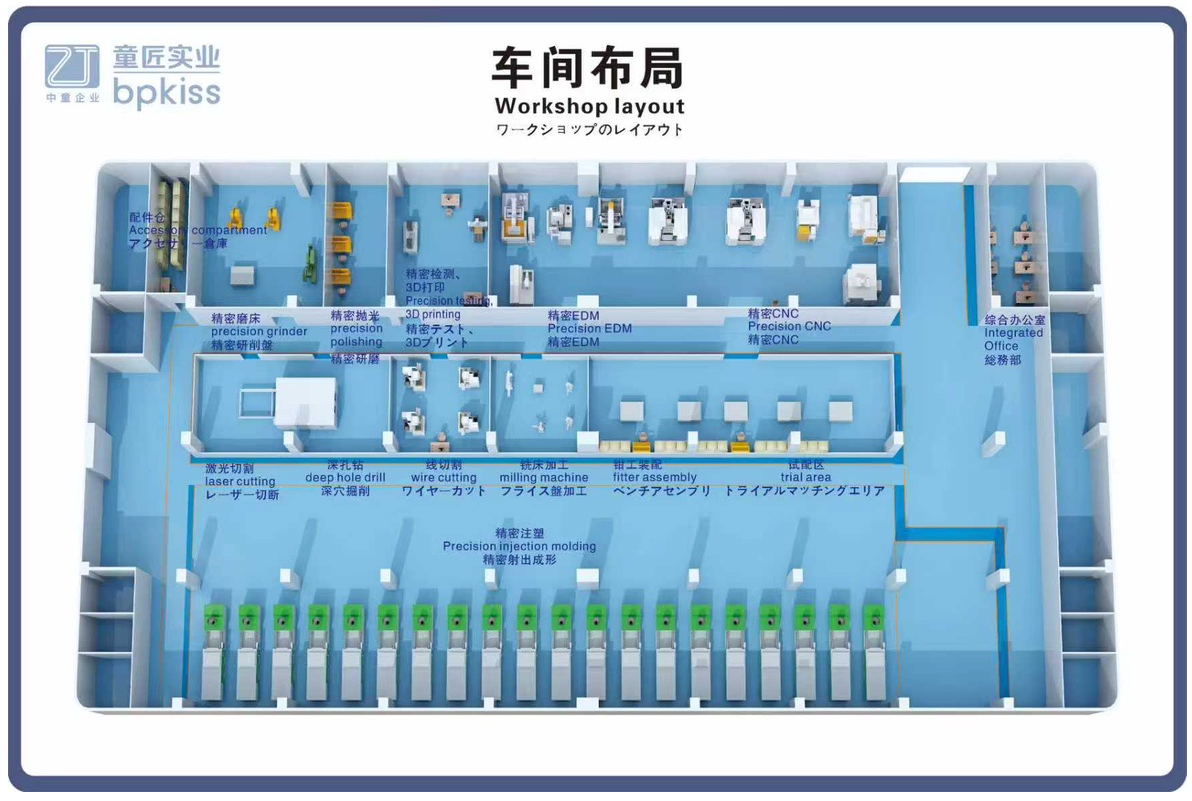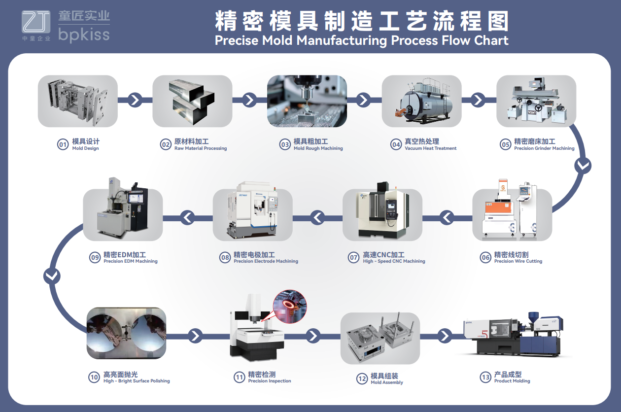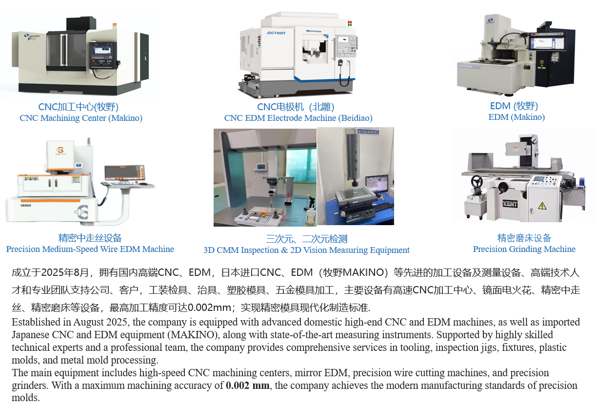 Key equipment includes high-speed CNC machining centers, mirror EDM, precision wire-cutting machines, and precision grinders—achieving a maximum machining accuracy of 0.002 mm and setting a new benchmark for modern precision mold manufacturing.